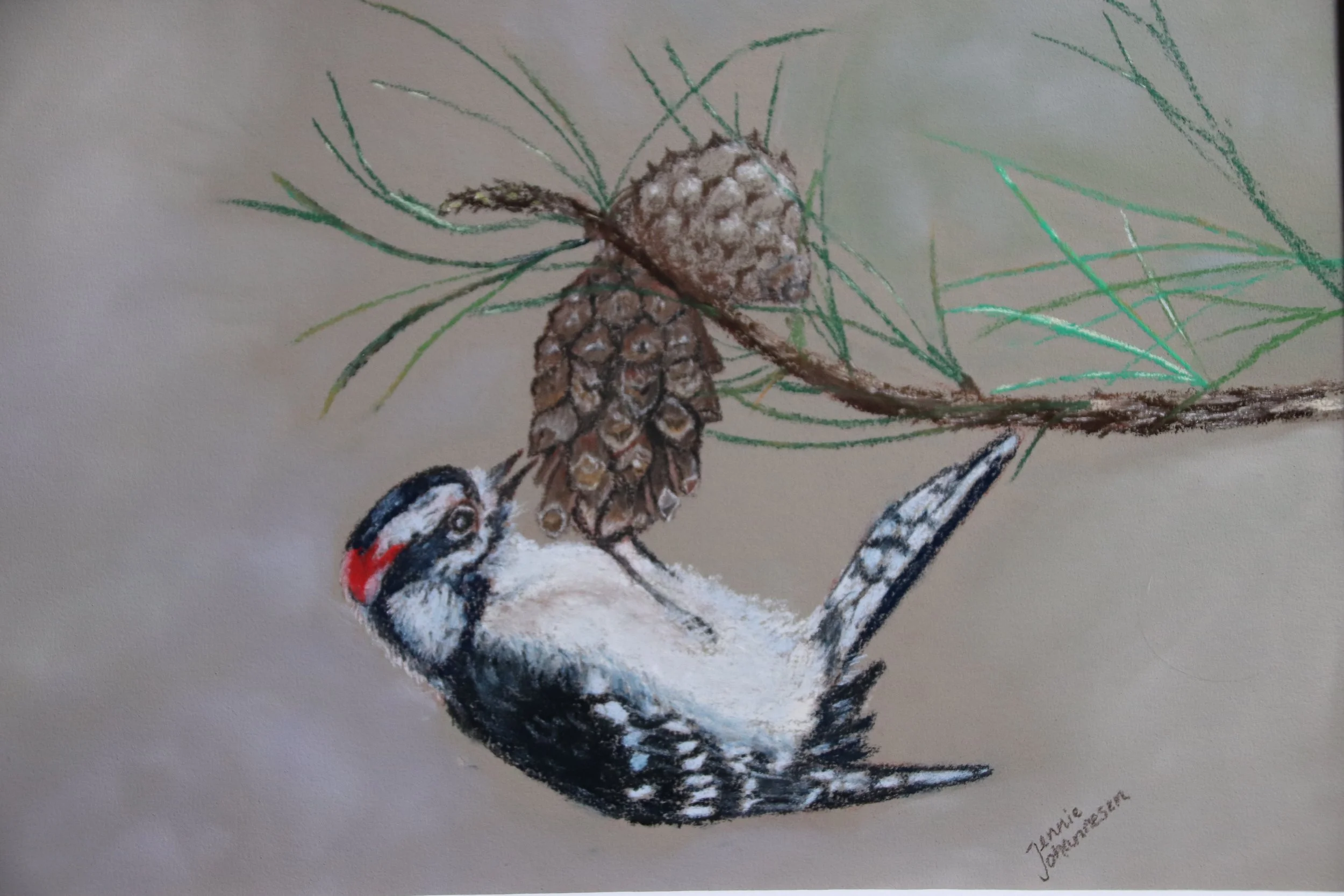 "Downy Woodpecker on a Pine Cone" - Soft Pastel Painting - 12" x 15" - Framed in Silver with a white mat $325.00